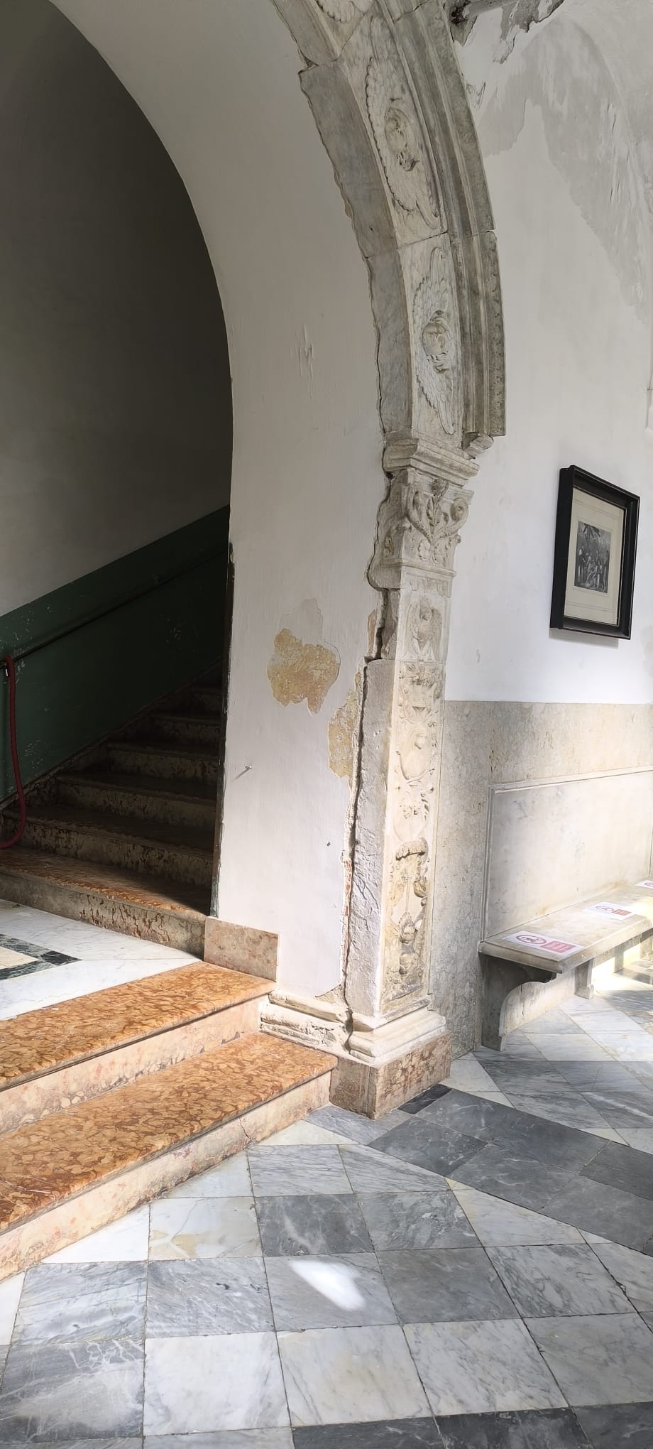 Anche ieri, come spesso avviene la domenica e nei fine settimana, complice anche una giornata dalla temperatura piu’ che mite, numerosi turisti hanno visitato la struttura che peraltro ospita all’interno, una dolceria, “I segreti del chiostro”, dove tanti si affollano per comprare prodotti tipici palermitani. Ma lo spettacolo, come potete vedere dalle foto, è desolante, per usare un eufemismo. Dovunque si riscontrano gli effetti delle infiltrazioni d’acqua in quanto le piogge hanno causato danni significativi alle volte e alle pareti, con evidenti segni di umidità e muffa. All’interno intonaci cadenti con molte superfici che presentano distacchi e crepe, con porzioni di intonaco che si sono staccate, lasciando esposte le murature sottostanti. Per non parlare degli affreschi deteriorati con le decorazioni pittoriche, un tempo vivaci e dettagliate, oggi sbiadite, scolorite o parzialmente perdute. E’ evidente l’abbandono e incuria che si nota anche per la presenza di erbacce e piante infestanti che hanno invaso il giardino centrale e alcune aree pavimentate, contribuendo all’aspetto trascurato del luogo e l’accessibilità ridotta con alcuni percorsi ostruiti o pericolosi che rendono difficile la visita e scoraggiano l’afflusso turistico. Evidenti sono i danni agli elementi architettonici con le colonne, le cornici e le decorazioni in pietra soggette a erosione e frammentazione. E’ chiara l’assenza di manutenzione regolare e la mancanza di interventi conservativi che ha accelerato il processo di degrado, mettendo a rischio l’integrità del chiostro.