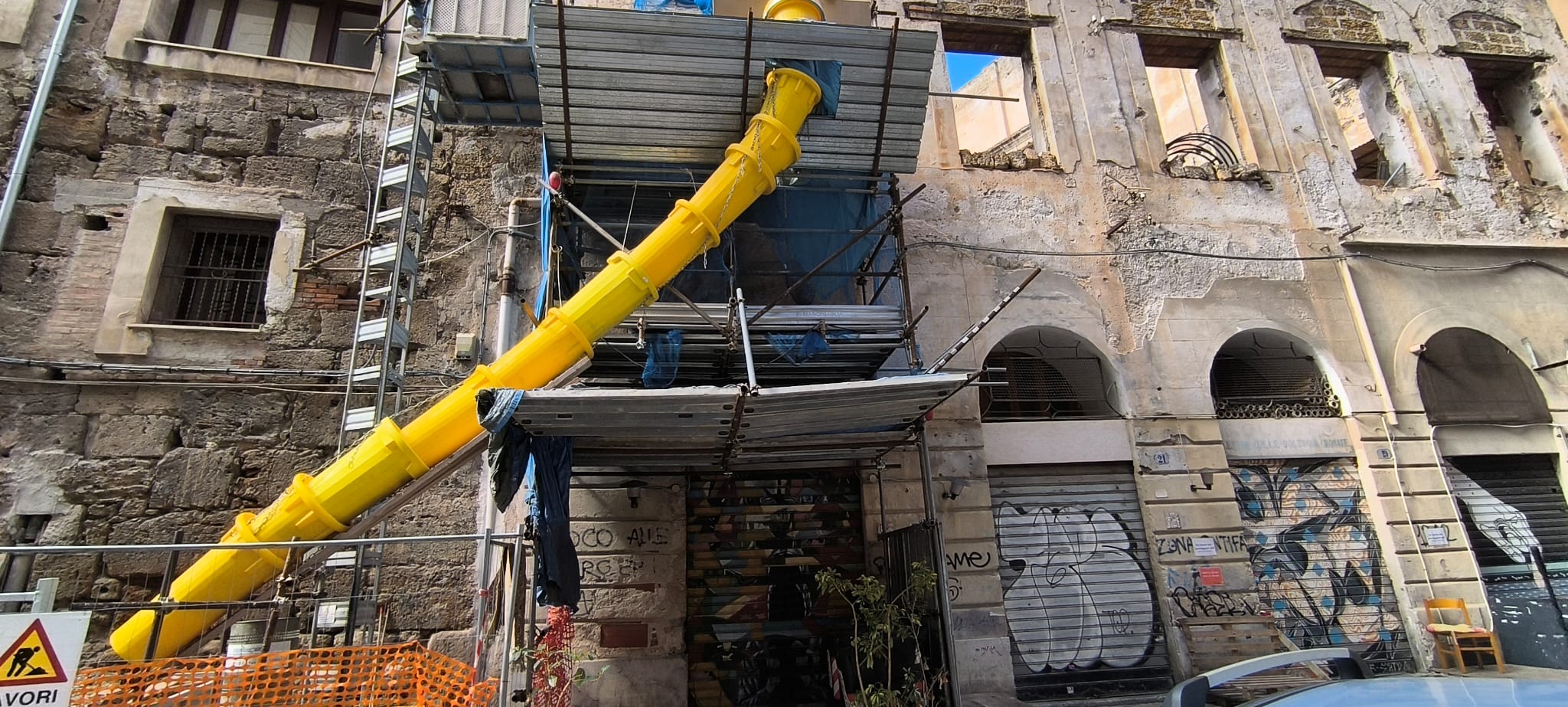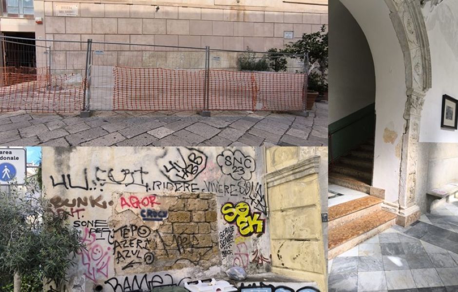 Il chiostro, parte integrante del complesso monastico di Santa Caterina, si affaccia sulla splendida Piazza Pretoria ed è circondato da un silenzio che stride con la sua storia gloriosa. Per anni, le sue colonne scolpite, le volte affrescate e i giardini interni hanno sofferto l’incuria e la mancanza di interventi strutturali. Le piogge hanno aggravato le infiltrazioni, mentre la vegetazione spontanea ha invaso gli spazi, rendendo difficile l’accesso e pericolosa la visita.