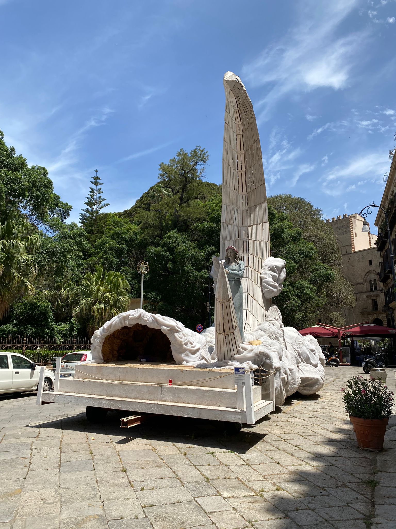 Il carro del 2023 invece si ispira a due eroi siciliani: Biagio Conte e padre Pino Puglisi. Realizzato con materiali di risulta, il manufatto incarna l’idea di sostenibilità ambientale e unisce presente e passato, tradizione e contemporaneità. Realizzata da Filippo Sapienza, 34 anni e laureato in storia dell’arte e specializzato in arte sacra, l’opera, ha affascinato migliaia di cittadini con una mezza luna con la statua di santa Rosalia posizionata nella parte inferiore e sopra la quale sono state poste delle nuvolette e degli angioletti.