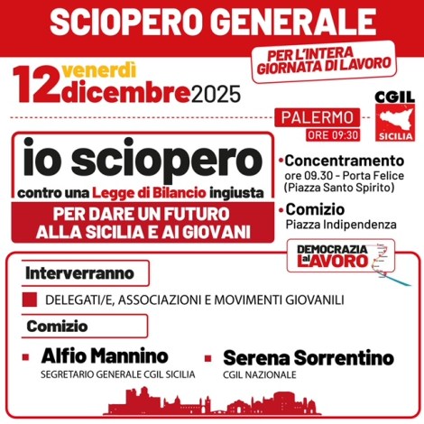 Anche in Sicilia la Cgil scenderà in piazza dopodomani, venerdì 12 dicembre, per lo sciopero generale indetto a livello nazionale contro la legge di bilancio del governo Meloni.