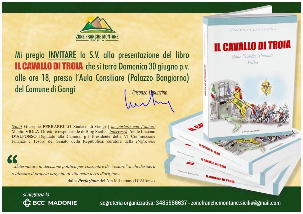 “Il cavallo di Troia” è nuovo libro di Vincenzo Lapunzina che verrà presentato a Gangi domenica 30 giugno alle ore 18, nel contesto del settecentesco e prestigioso Palazzo Bongiorno, sede del civico consesso della comunità gangitana. L’autore ne discuterà con il direttore responsabile di BlogSicilia, Manlio Viola che a settembre prossimo maturerà i suoi primi 40 anni di attività giornalistica. All’evento interverrà l’onorevole Luciano D’Alfonso, deputato alla Camera e già presidente della VI Commissione Finanze e Tesoro del Senato della Repubblica.