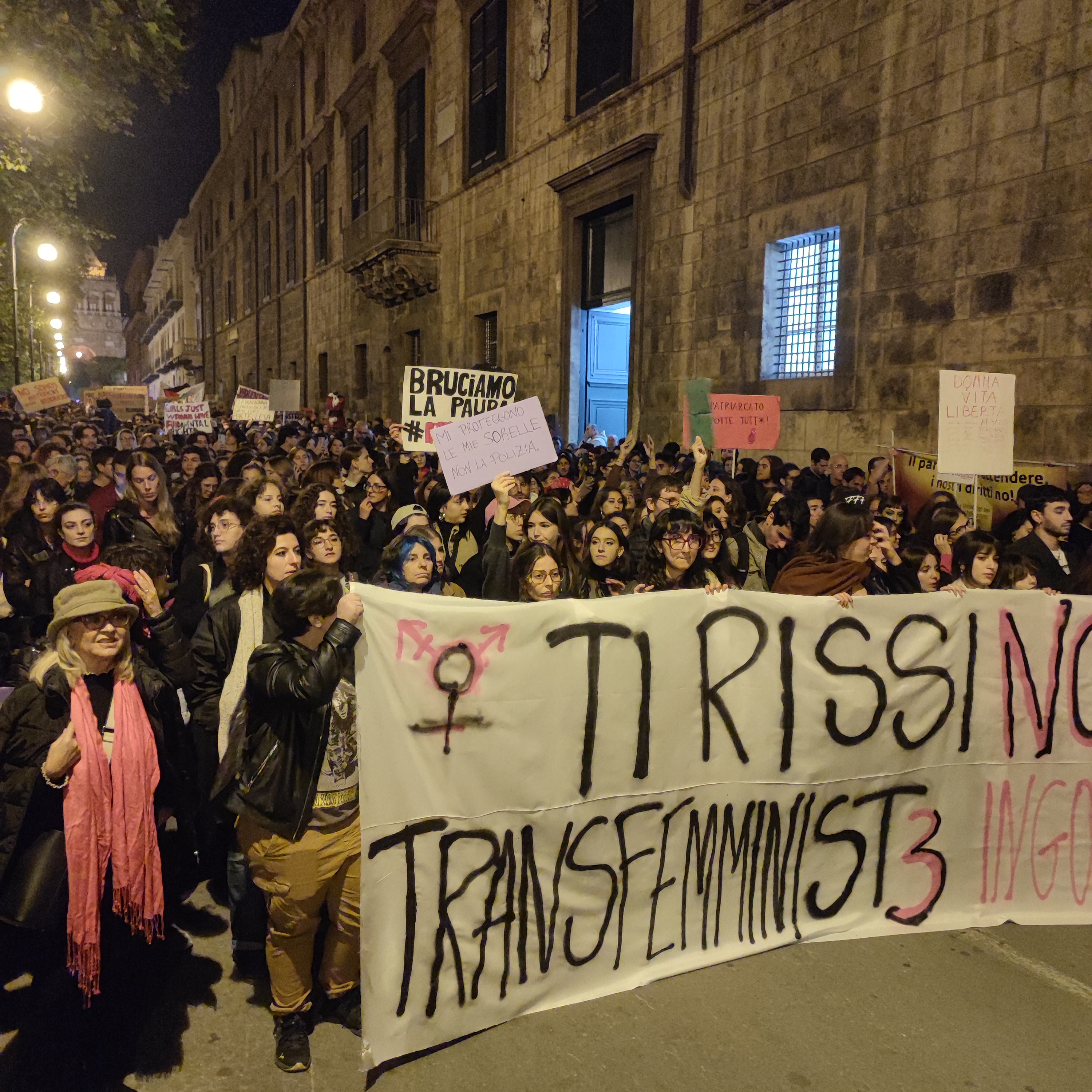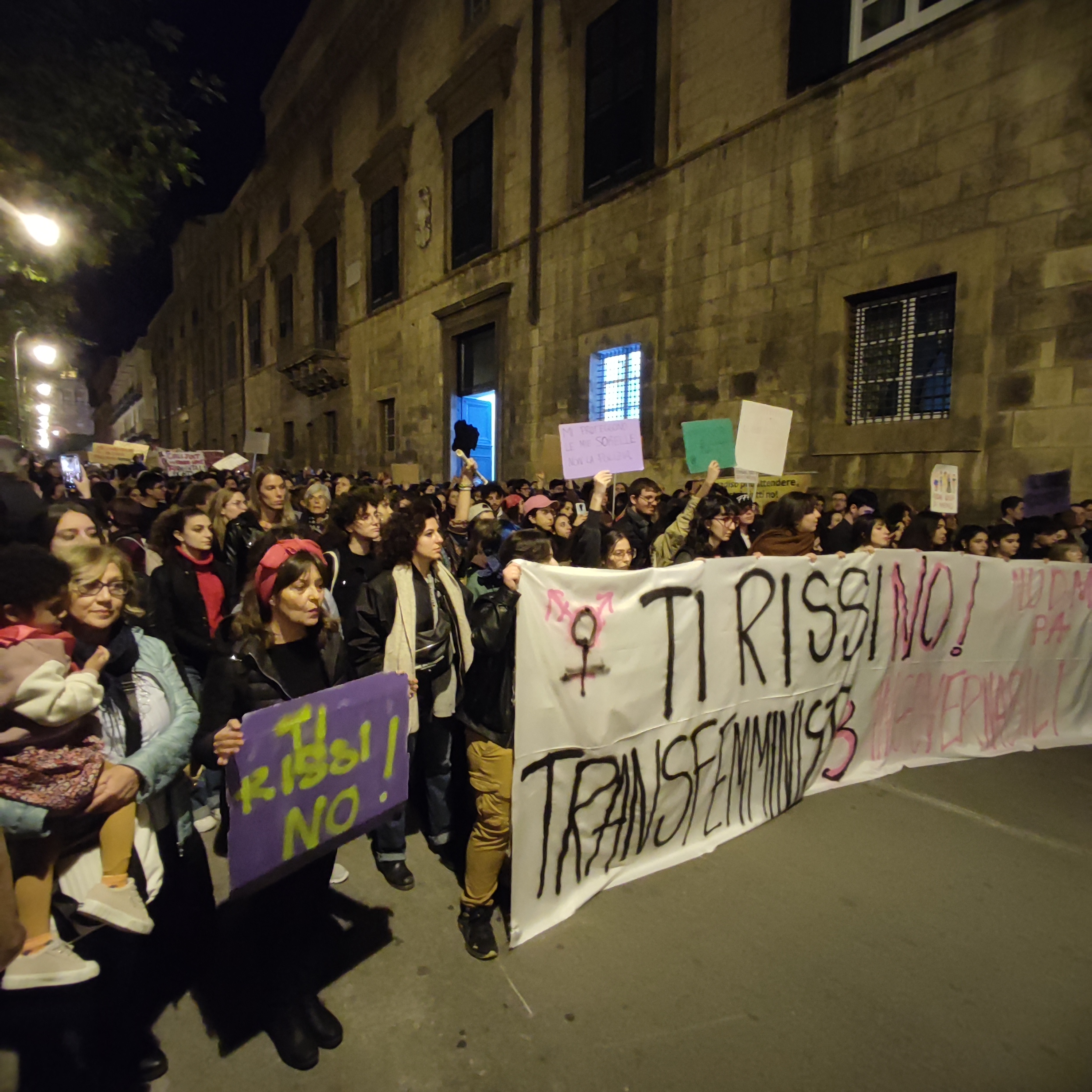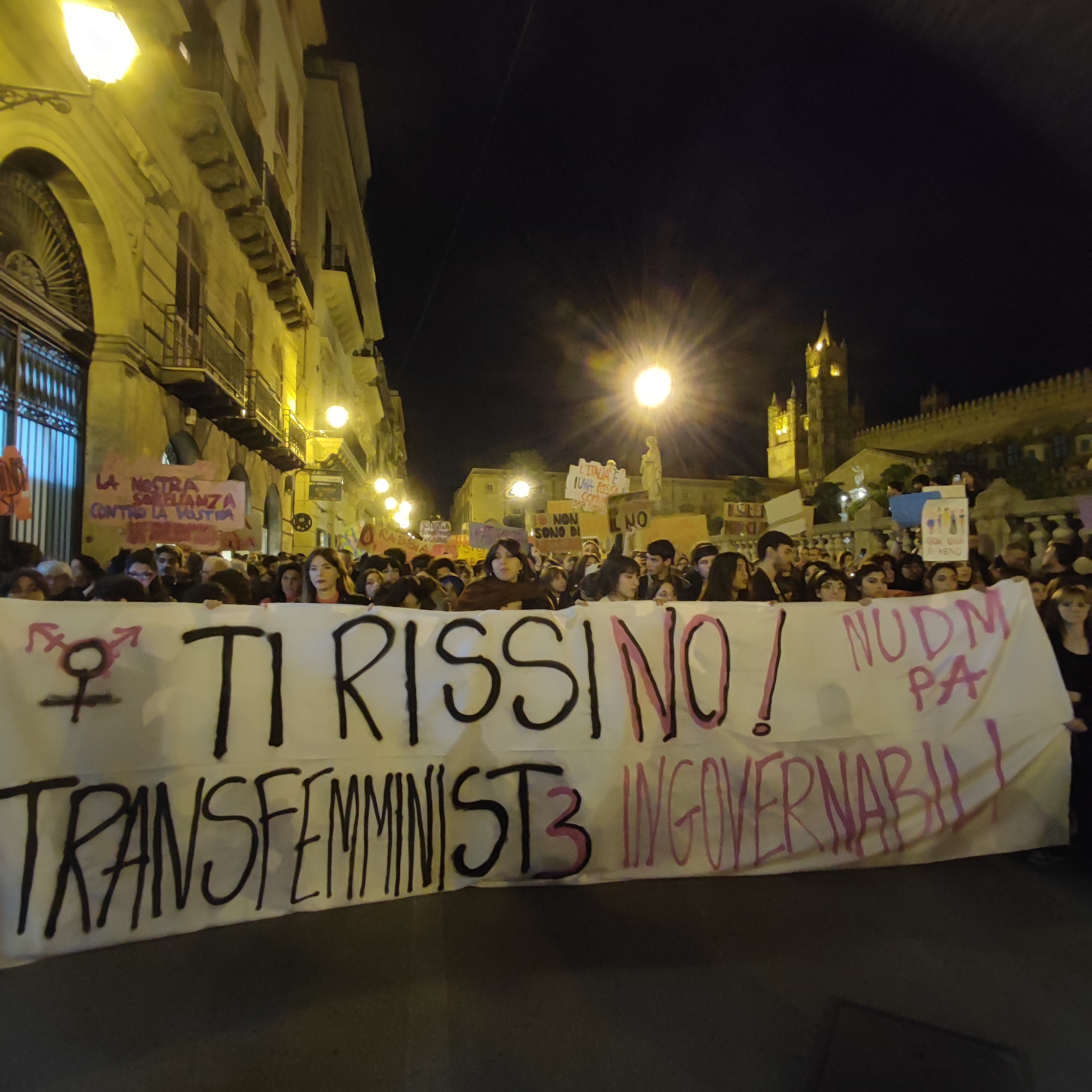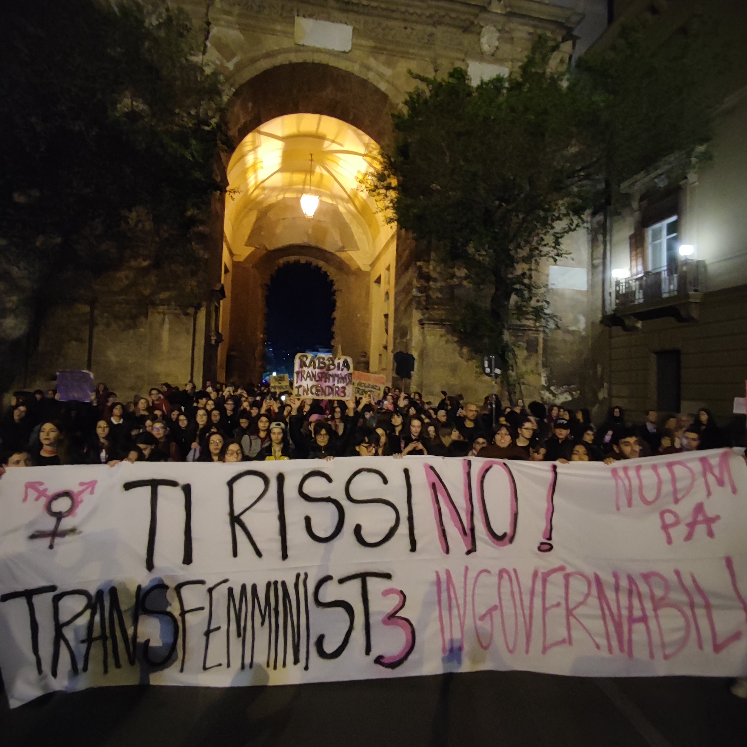 “Come donne, persone non binarie e LGBTQIA+, persone razzializzate, migranti, con disabilità, persone che soffrono particolarmente la povertà economica, transfemministe sappiamo che patriarcato e capitalismo ci stritolano sempre e ovunque nella loro morsa, e al sud quei meccanismi di sovradeterminazione, sottomissione e marginalizzazione aggrediscono con più ferocia!” A dare il via alla manifestazione una performance dell’associazione “Spazio Donna Zen” che ha portato in piazza una pièce teatrale tratta da Stai zitta di Murgia ove ha trovato spazio un canto di Rosa Balistreri. Sullo striscione un messaggio chiaro e sibillino: Ti rissi no! Transfemminist3 ingovernabili