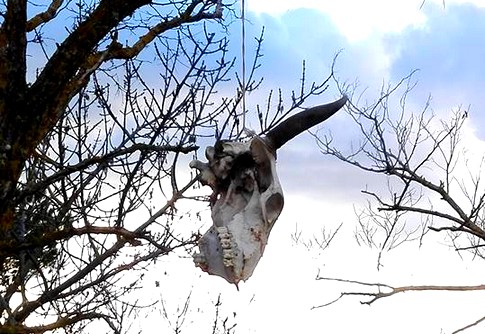 Un vitellino morto, arrotolato nel filo spinato ed a distanza di poche decine di metri, due teschi di mucca appesi a due diversi alberi.