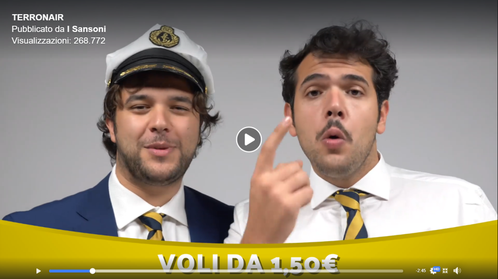 E così i due comici hanno fondato “Terronair”, la compagnia aerea in salsa meridionale che ti fa viaggiare al prezzo di un caffè. La benzina che si divide al costo di 1.50 euro ciascuno, le valigie che si possono imbarcare ma rigorosamente vuote in modo da poterle riempire di cibo al ritorno in Sicilia, sono alcune delle proposte bizzarre che ironizzano sui luoghi comuni del meridionale in vacanza.