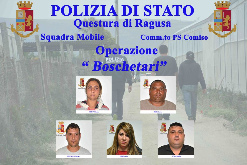 L’operazione della squadra mobile di Ragusa, coordinata dalla Procura distrettuale di Catania, è stata denominata “boschetari”, senzatetto in romeno, perché la banda curava il reclutamento in Romania, il trasferimento in Italia e l’immissione nel settore del lavoro agricolo di numerosi connazionali, tutti scelte tra persone in stato di estremo bisogno, analfabete o appena capaci di leggere e scrivere ed in condizione di peculiare vulnerabilità.