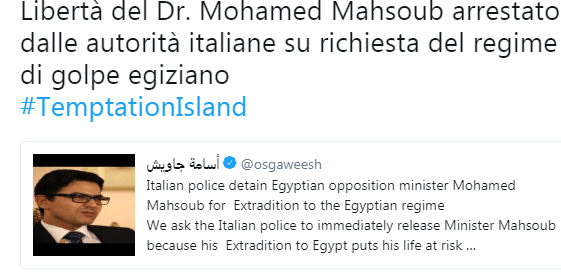“La polizia italiana mi trattiene da tre ore vicino a Catania su richiesta delle autorità egiziane che chiedono di consegnarmi a loro senza rivelare le accuse contro di me” ha scritto lo stesso Mahsoub su twitter.