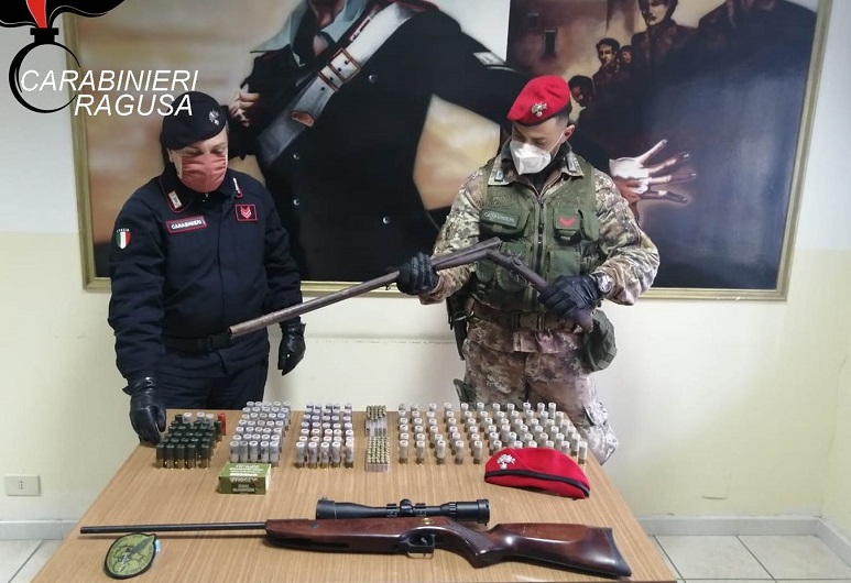 Sono finiti nella rete dei militari un ventenne ed un sessantatreenne, entrambi ai domiciliari: il primo è stato trovato in possesso di un fucile a pompa marca Beretta modello R.S.200p e 6 cartucce calibro 12. I carabinieri hanno scoperto che l’arma rinvenuta era stata rubata a Vittoria nel 2002 come risulta in una denuncia al commissariato di polizia di Vittoria; il secondo aveva con se una carabina calibro 9 marca Saint’Etienne, trafugata a Vittoria nel 2016 e 44 cartucce calibro 9 di cui 2 modificate, per aumentarne le potenzialità offensive. L’arma e le munizioni, detenute illegalmente, sono state rinvenute all’interno di un agrumeto di proprietà del 63enne, a pochi passi dalla sua abitazione.