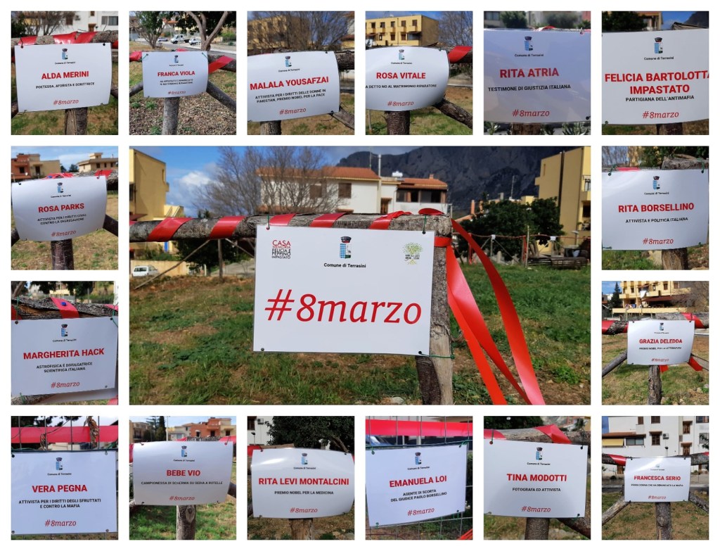 Terrasini, 8 marzo 2020, una installazione per le donne che si impegnano per la collettivitá.Quest’anno, l’8 Marzo si presenta in un clima diverso dal solito, l’emergenza epidemiologica da COVID-19 ci induce a cambiare temporaneamente i nostri comportamenti ed abitudini, ci chiede una maggiore riflessione sulle relazioni umane, sul rispetto di noi stessi e degli altri, che va oltre ogni atteggiamento individualista, spingendoci maggiormente a pensare alla collettività ed in particolare alle fasce più deboli della popolazione. Proprio per questo e nel rispetto della salute pubblica, è necessario evitare iniziative che rischino di creare affollamenti di persone che non consentano di mantenere la distanza di sicurezza interpersonale di almeno un metro. Seguendo quindi questo principio ed attenendoci scrupolosamente al Decreto del Presidente del Consiglio dei Ministri (Dpcm 4 marzo 2020), il Comune di Terrasini (in particolare l’assessorato alla cultura ed alle pari opportunità), con il Comitato Civico Ralli Montana Cassarà e Casa Memoria Felicia e Peppino Impastato vogliono celebrare la Giornata internazionale dedicata alla Donna con un simbolo all’interno del Montana – Cassarà Cultural Park sito a Terrasini, che non prevede alcuna inaugurazione ed aggregazione, ma soltanto la testimonianza delle conquiste sociali, politiche ed economiche delle donne, contro le discriminazioni e le violenze cui sono state e sono ancora oggetto in tutte le parti del mondo. Abbiamo piantato all’interno del parco due alberelli di mimosa omaggiati dal vivaio Delia di Terrasini e posto delle targhe con i nomi di alcune donne del passato e del presente che hanno lottato e lottano contro discriminazioni, mafia e patriarcato e che si sono affermate in ambito artistico, letterario, scientifico, sportivo, politico, sociale e umano. Un nastro rosso dà continuità all’impegno di queste donne, tra passato, presente e futuro.Le prime giornate internazionali dedicate alle donne si tennero a partire dal 1909, erano mirate principalmente al riconoscimento del diritto di voto femminile. In Italia la prima si svolse nel 1922. Si racconta che fu scelta la data dell’8 marzo per ricordare la morte di centinaia di operaie in un rogo di una fabbrica di camicie nel 1908, in realtà questo episodio non è confermato, ma la giornata è comunque legata alle rivendicazioni femminili, alla commemorazione delle vittime e all’orgoglio femminile. La riflessione è attuale visto che ancora oggi viviamo in una situazione di disarmonia tra i generi, assistiamo a violenze quotidiane sulle donne e le donne devono fare molta più fatica e lottare quotidianamente per affermarsi.A maggior ragione in momento come quello che stiamo vivendo in cui vediamo uomini e donne fronteggiare insieme l’emergenza, in primo luogo medici, infermieri/e operatori e operatrici sanitari è importante anche impegnarsi per sviluppare in tutti una delle facoltà più legate al genere femminile, la cura dell’altro, ed impegnarsi per la solidarietà tra i generi e la crescita di un senso umanitario. Dedicato a: Felicia Bartolotta Impastato – Partigiana dell’antimafia; Francesca Serio – Prima donna che ha denunciato la mafia; Rita Atria, Testimone di giustizia italiana; Rita Borsellino – Attivista e politica italiana; Emanuela Loi – Agente di scorta del Giudice Paolo Borsellino; Rita Levi Montalcini – Premio Nobel per la medicina; Margherita Hack – Astrofisica e divulgatrice scientifica italiana; Alda Merini – Poetessa, aforista e scrittrice; Grazia Deledda – Premio Nobel per la letteratura; Tina Modotti – Fotografa ed attivista; Rosa Vitale – Ha detto no al matrimonio riparatore; Franca Viola – Prima donna che ha rifiutato il “matrimonio riparatore”; Vera Pegna – Attivista per i diritti degli sfruttati e contro la mafia; Bebe Vio – Campionessa di scherma su sedia a rotelle; Malala Yousafzai – Attivista per i diritti delle donne in Pakistan, Premio Nobel per la pace; Rosa Parks – Attivista per i diritti civili contro la segregazione; tutte le donne che ogni giorno si impegnano per la collettività.