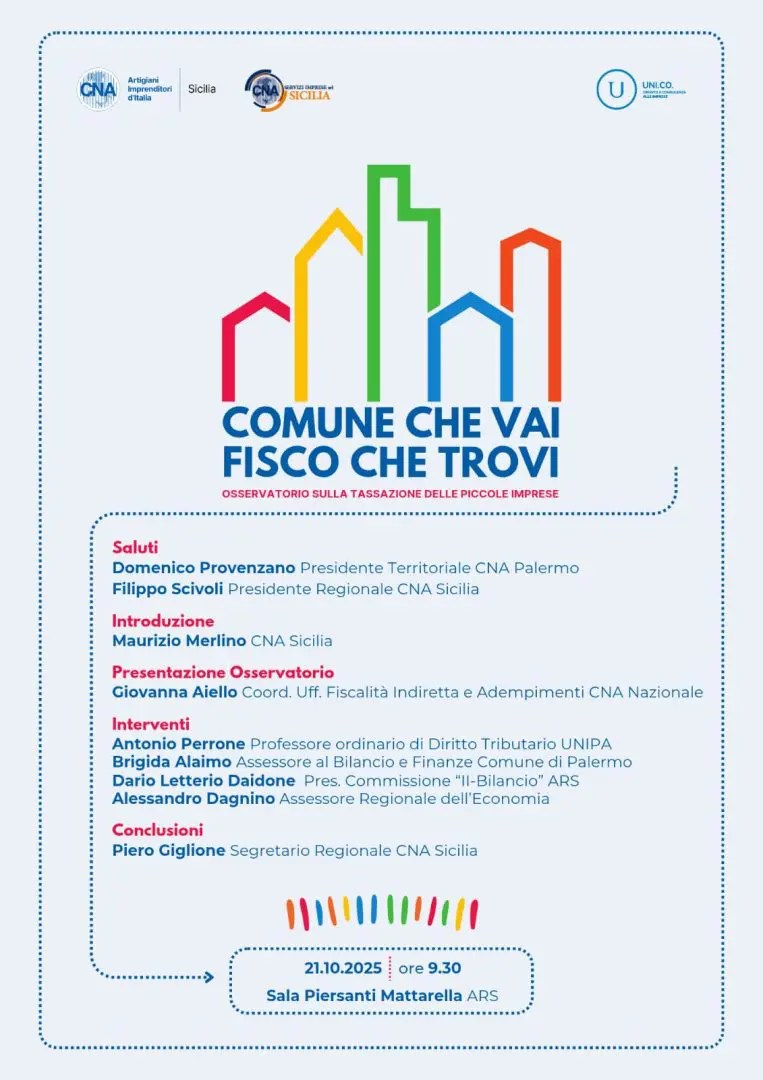 PALERMO (ITALPRESS) – CNA Sicilia presenterà il Rapporto “Comune che vai, fisco che trovi”, realizzato dall’Osservatorio sulla tassazione delle piccole imprese del Dipartimento politiche fiscali e societarie di CNA. L’evento, dedicato alle dinamiche fiscali che interessano le realtà imprenditoriali più piccole del territorio, si terrà lunedì 21 ottobre 2025, alle ore 9.30, presso la Sala Piersanti Mattarella dell’Assemblea Regionale Siciliana a Palermo.
