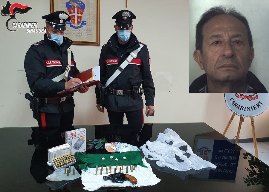 I carabinieri di Siracusa hanno arrestato per spaccio di droga e detenzione illegale di armi Luciano Di Nicola, 61 anni, disoccupato, siracusano, con precedenti penali. Nel corso della perquisizione nella sua abitazione, i militari del comando provinciale hanno trovato tra la biancheria una pistola Smith&Wesson calibro 38, scarica, con congegni meccanici perfettamente funzionanti e con matricola abrasa, 67 cartucce calibro 38, 3 cartucce calibro 7,65, 4 dosi di cocaina, del peso complessivo pari a 4,5 grammi, materiale per il confezionamento delle dosi, due bilancini di precisione e 210 euro in contanti, frutto della presunta attività di spaccio.