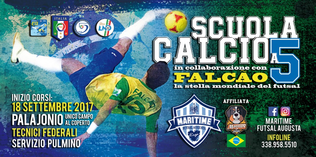 La scuola calcio è identificata dal logo che ritrae Falcao, con la maglia della nazionale brasiliana, nell’esecuzione di una spettacolare rovesciata a simboleggiare la classe, la tecnica, la fantasia e le evoluzioni che hanno reso famoso in tutto il mondo il campione brasiliano; logo completato dal nome della scuola calcio “F12 Maritime, Futsal Training Center” e dal segno identificativo del Maritime Augusta. Per info sulla scuola calcio: contattare il seguente numero 338 958 55 10.