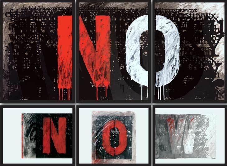 Intento visibile nelle tele dell’artista siracusano Luciano Puzzo, in cui la protesta urlata dei giganteschi “No” si rovescia nel messaggio positivo “On”. O ancora nelle opere di Alba Savoi dove si evince un’operazione effettuata sul linguaggio: un confronto tra scrittura inintelligibile e quella conosciuta, come per la decrittazione di una stele egizia. Se, poi, l’artista Teresa Pollidori mostra la carica emotiva di immagini drammatiche a cui la società si è ormai assuefatta attraverso parole-forma digitali nella loro tridimensionalità, Giuliano Mammoli priva le lettere alfabetiche del loro significato originario per lasciarne solo un vago ricordo. Ilia Tufano gioca coi ritmi visivi nel loro linguaggio segnico e allo stesso tempo tonale. Rita Mele, infine, esibisce composizioni diaristiche non decifrabili e volti caratterizzati da una sensazione di assenza.