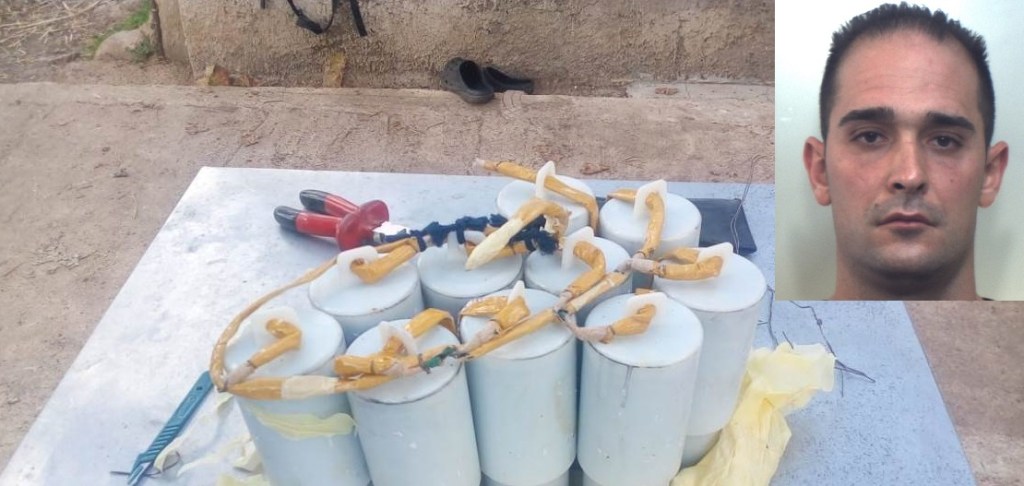 La perquisizione ha anche permesso di rinvenire un potente ordigno esplosivo artigianale, costituito da diversi cilindri di plastica riempiti di esplosivo e collegati fra loro da una miccia che ne avrebbe permesso la deflagrazione contemporanea. La potenza dell’ordigno, che l’uomo avrebbe tentato di sminuire asserendo che si trattava di un oggetto da usare a Capodanno, era invece tale da poter far saltare in aria un’autovettura.