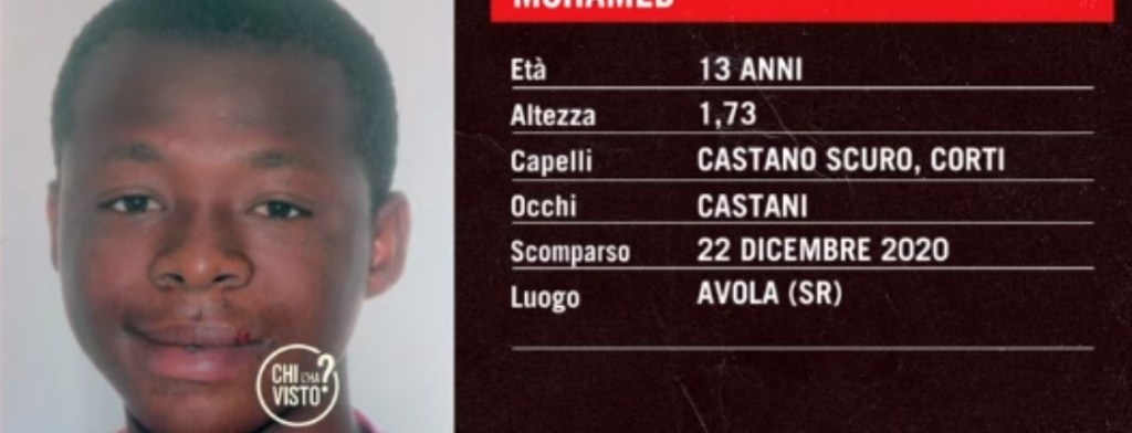 Risulta scomparso dal 22 dicembre Mohamed Cherif, un ragazzino della Costa d’Avorio che ha appena compiuto 14 anni, ospite della Casa di Sarah, una comunità per minori di Avola, nel Siracusano. Del suo caso si è occupata la trasmissione televisiva “Chi l’ha visto?” su Rai 3 ma nelle ore scorse sono partiti dal suo telefonino, spesso acceso, messaggi, inviati ad altri ospiti della struttura di accoglienza.