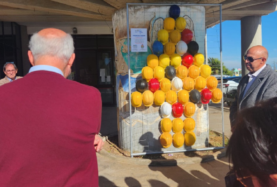 Un albero della sicurezza, composto da caschi usati dai lavoratori del Petrolchimico di Priolo, è stato allestito nell’area del Comune di Priolo.