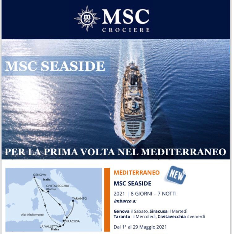 Le crociere che toccheranno Siracusa, partiranno da Genova il sabato e faranno scalo anche a Malta, Civitavecchia e Taranto. La nave Seaside è una delle più innovative, anche dal punto di vista dell’impatto ambientale, della flotta; la sua caratteristica è di disporre di una promenade esterna, con negozi bar e piscina, nei ponti più bassi così che i passeggeri possano godersi meglio il mare.