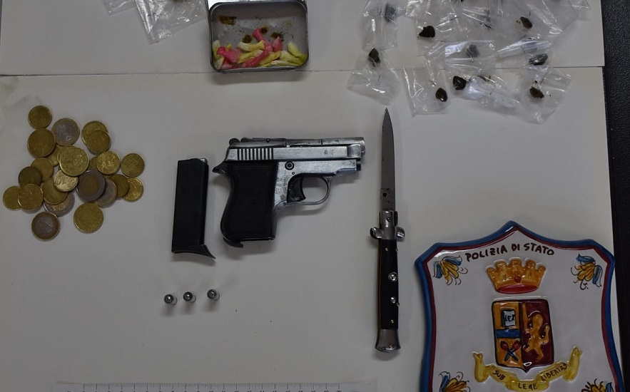 Il ventiseienne deve anche rispondere di detenzione di arma, in quanto nella sua disponibilità avrebbe avuto una pistola calibro 22 con matricola abrasa. Nel complesso, gli agenti della Squadra mobile hanno sequestrato alcune dosi di hashish, cocaina, marijuana e denaro contante, 245 euro, probabile frutto dell’attività di spaccio.