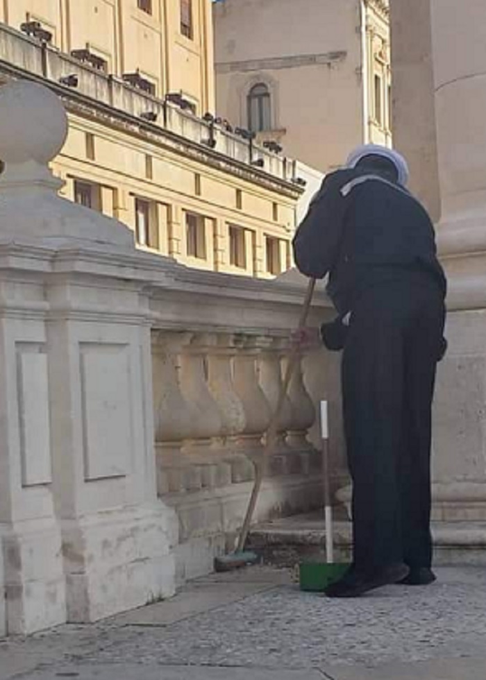 La sua foto, nel volgere di pochi minuti, è diventata virale. Perché vedere un vigile urbano, in divisa, armato di scopa e paletta per pulire il sagrato della Cattedrale di Siracusa è una rarità assoluta.
