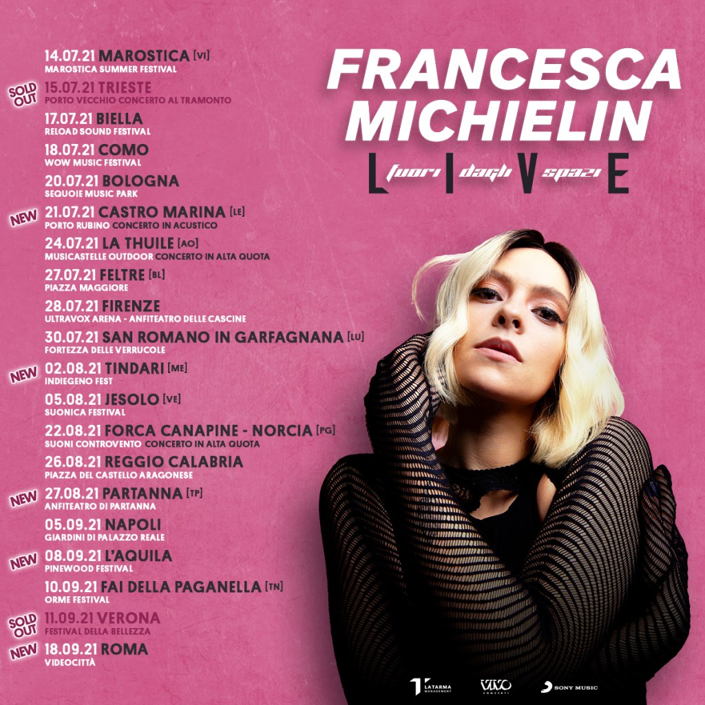 Ad accompagnare la cantautrice sul palco ci saranno il polistrumentista Francesco Arcuri, Ernesto Lopez alla batteria e percussioni e Benjamin Ventura alle tastiere, in nuovi e sorprendenti arrangiamenti inediti per un live che rappresenta la voglia di riprendersi i propri spazi e la necessità di raccontare questo momento. Durante questo nuovo tour Francesca Michielin ripercorre la sua carriera – 10 anni di musica proprio quest’anno – fino ad arrivare ai più recenti singoli dell’ultimo album FEAT (Fuori dagli spazi).