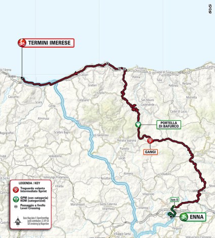Tappa di media montagna che supera una serie di salite di pendenza limitata, ma di lunghezza oltre i 15 km. Si scalano nell’ordine Rocca Vutura, Sperlinga (4 km) e la Portella di Bafurco dal versante sud. Seguono quasi 40 km di discesa (con brevi contropendenze all’interno) prima di inserirsi sulla strada statale costiera e raggiungere l’arrivo. Strade all’interno della Sicilia molto articolate con numerose curve e saliscendi sempre abbastanza larghe e in discreto stato di manutenzione.