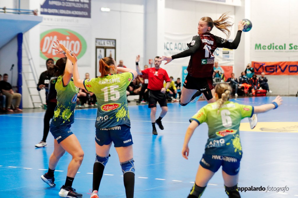 Con Bacjova e Rossomando, Salerno ritrova il +4 costringendo Conte al minuto di sospensione (49’ 20-16). Erice si affida all’esperienza di Cozzi e ai talenti cristallini di Gorbatsjova e di Ekoh accorciando sul meno 1 al 51’ sul 20-19.