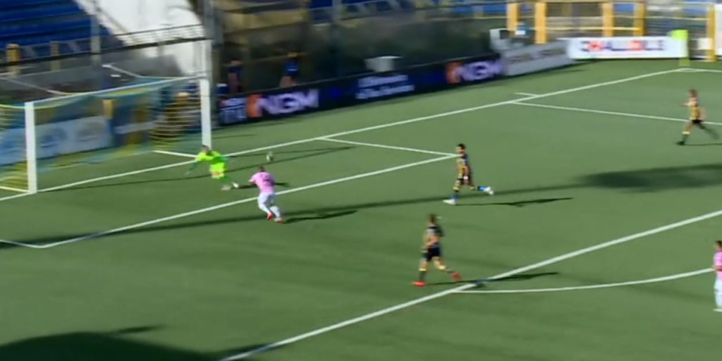 Vantaggio dei siciliani al 18° con Nicola Valente (nella foto il momento del tocco in rete) e raddoppio al 67° con Andrea Saraniti e la sua specialità: il colpo di testa.