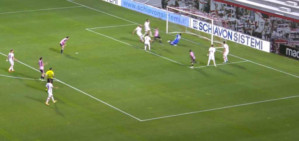 Gol sbagliato, gol subito ma annullato. Il Padova al 26′ segna con Bifulco ma in fuorigioco. In questa occasione la difesa rosanero è rimasta altissima.