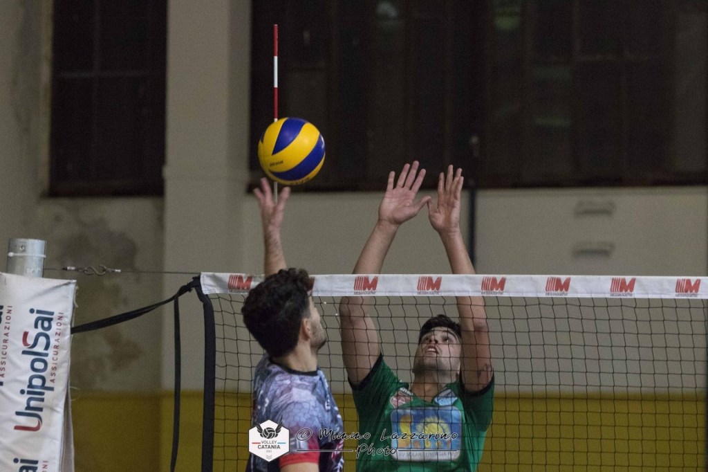 Nicola Ferro si affida a Gallo in cabina di regia, in diagonale con Gruessner, centrali Blanco e Banaouas, Lombardo e Giuseppe Ferro coppia di banda, con Sutera a difendere da libero la seconda linea. Buoni ritmi con i neroverdi a condurre di misura. I palermitani vanno sul 14-19 ma i padroni di casa riaccendono la luce e vanno sul pari. Neroverdi ancora avanti sul +2 fino al 22-24. Al traguardo, la Volley Catania ribaltano grazie anche ad un buon turno di battuta e chiudono 26-24 la prima frazione.