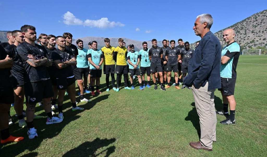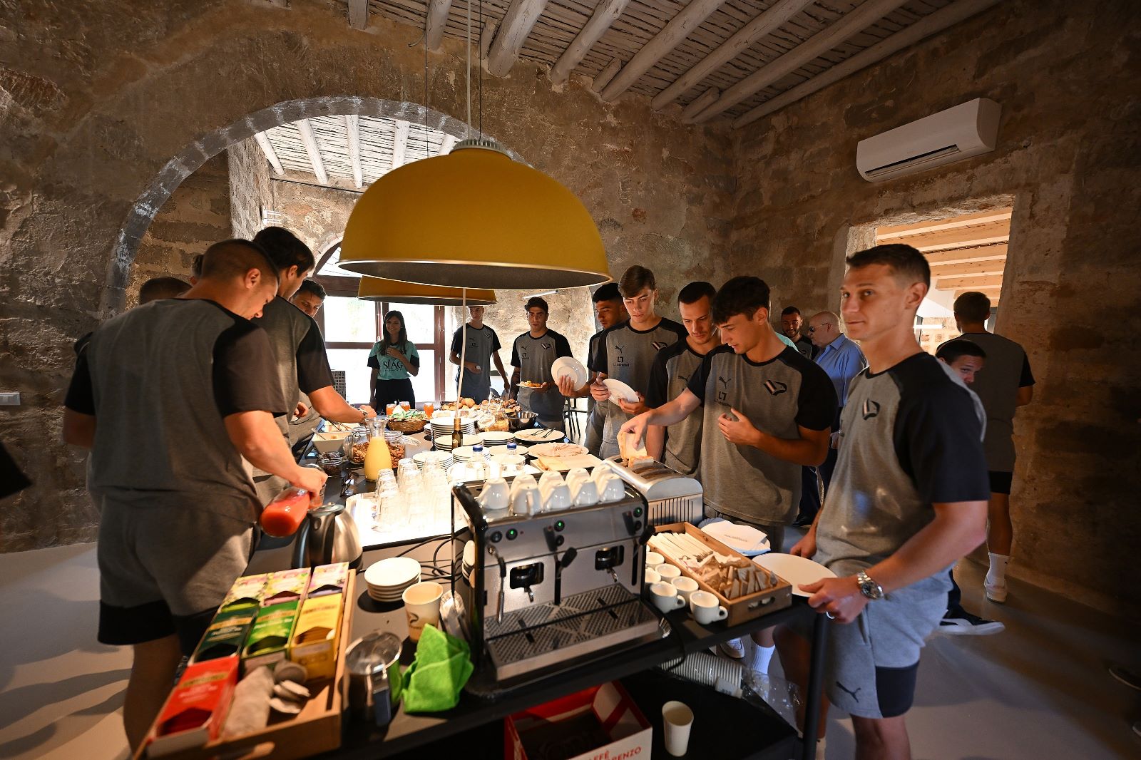 Dopo la colazione in club house, giocatori e staff hanno proseguito con una breve visita degli spazi a disposizione e si sono riuniti in campo per un saluto speciale del presidente Mirri e del tecnico Corini.