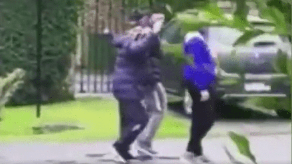 Diego stava passeggiando ma non da solo. Ci sono due persone davanti a lui e su cui si è appoggiato per camminare ma con fatica. Dietro c’era una terza persona.