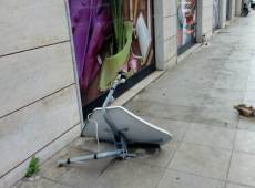 La pesante antenna satellitare è rovinata al suolo a pochi passi dall'ingresso di un negozio di abbigliamento cinese che sorge nei pressi ed ha letteralmente sfiorato un uomo ed una donna che si trovavano a passare lungo il marciapiedi.