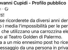 Libero accesso e pieno coinvolgimento delle persone con disabilità nei luoghi pubblici. Questo è il tema affrontato tramite un post "denuncia" di Giovanni Cupidi riguardo al facile ingresso all'interno dei locali del teatro Golden di Palermo. L'appello: "artisti, organizzate spettacoli in luoghi realmente accessibili a tutti".