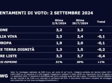 Centrodestra a vele spiegate spinto da Fratelli d'Italia che si avvia a diventare il primo partito della coalizione, 5 stelle che rischiano di sparire dopo aver abbandonato la coalizione di centrosinistra e Pd che, invece, guadagna per effetto proprio del divorzio.