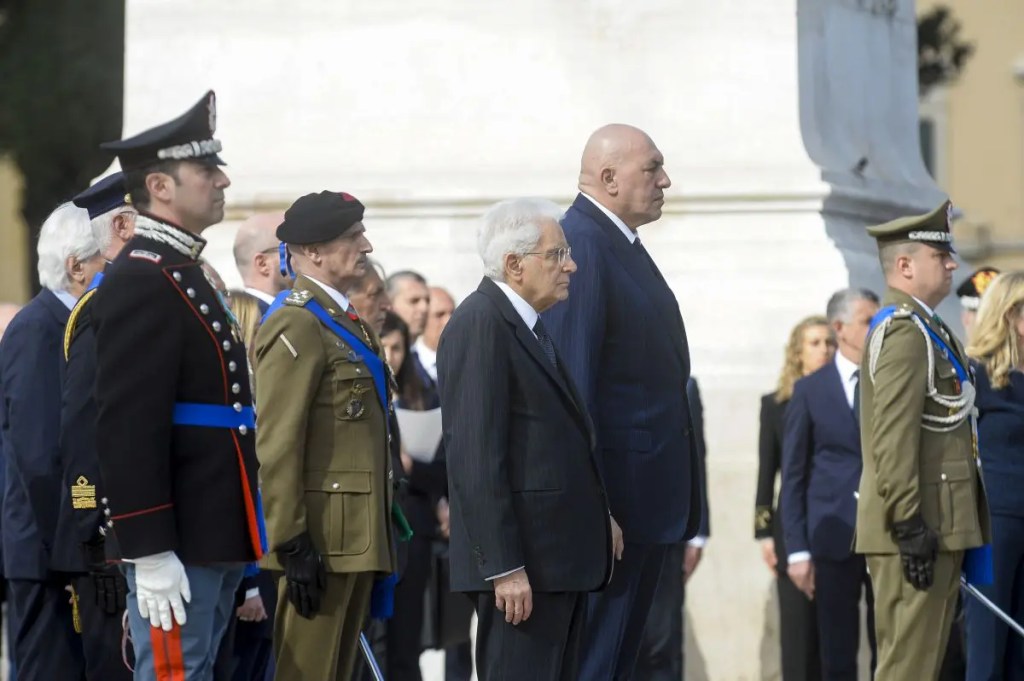 Meloni, i presidenti di Senato e Camera Ignazio La Russa e Lorenzo Fontana, il Presidente della Corte Costituzionale Giovanni Amoroso, il ministro della Difesa Guido Crosetto. Dopo la cerimonia degli onori e l’esecuzione dell’inno d’Italia il capo dello Stato ha deposto la corona sulla tomba del milite ignoto. Mattarella si recherà ora a San Severino Marche per le celebrazioni.