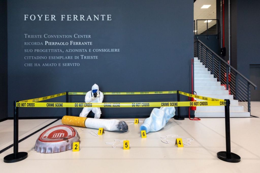 Per informare e sensibilizzare le persone, nelle principali piazze delle località coinvolte è stata realizzata un’installazione di grande impatto: una ‘scena del criminè in cui, accanto alle sagome delle vittime raffiguranti tartarughe, pesci o altri animali marini è stata posta la riproduzione gigante di un mozzicone, di un tappo di alluminio e di una bottiglietta di plastica come simboliche “armi del delitto”.