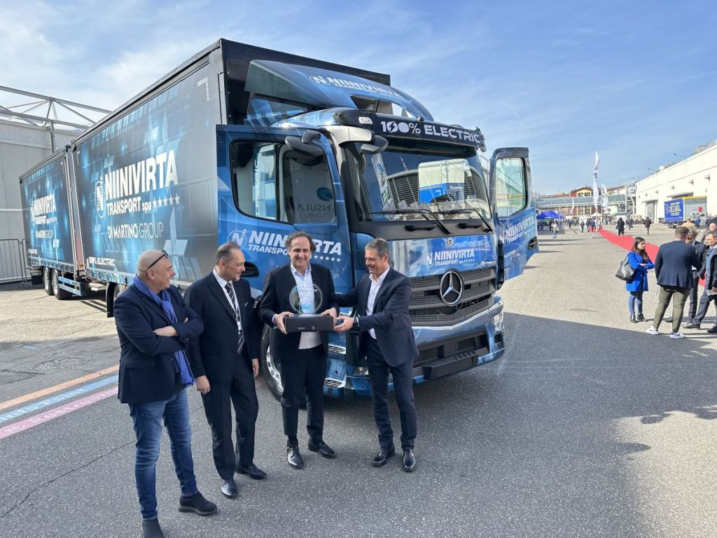 VERONA (ITALPRESS) – Riconoscimento per il Gruppo Fratelli Di Martino. Al LetExpo di Verona il presidente di Mercedes-Benz Trucks, Maurizio Pompei, ha consegnato all’azienda siciliana che da oltre 50 anni opera nell’ambito dei servizi per l’autotrasporto intermodale e nella logistica, una targa per eActros, il truck 100% elettrico di Mercedes, ritirato nei mesi scorsi per conto della consociata Niinivirta Transport.