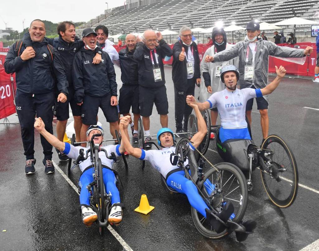 TOKYO (GIAPPONE) (ITALPRESS) – L’Italia eguaglia Seul 1988. Cinquantotto medaglie come in Corea del Sud, l’edizione più ricca per la delegazione azzurra, escludendo l’edizione di Roma 1960 (82 podi) in cui i numeri del movimento internazionale erano nettamente inferiori. Le dieci perle odierne arrivano da paraciclismo (1), nuoto (6), tiro con l’arco (1), atletica (2). La medaglia che brilla più di tutte di questo venerdì è l’oro conquistato nel team relay di handbike al Fuji Speedway dagli azzurri Luca Mazzone, Paolo Cecchetto, Diego Colombari (foto Bizzi/CIP), che hanno trionfato nel segno di Alex Zanardi, al quale hanno dedicato il trionfo nella gara di squadra in cui cinque anni fa era stato protagonista anche l’asso bolognese. Si è trattata della settima medaglia per il paraciclismo nei primi tre giorni di gara al Fuji Speedway. “E’ per te Alex”, hanno esclamato in coro i tre azzurri e tutti i presenti, compresi gli atleti di altre nazioni, si sono uniti ai cori per il mito Zanardi, celebrato anche dalle parole del presidente Luca Pancalli: “In una giornata dalle mille e una emozioni, merita una menzione particolare l’oro nel segno di Alex e dedicato ad Alex, a più riprese da tutta la squadra. Credo che questa sia la cosa più bella che possa venire dal mondo dello sport e dalla famiglia paralimpica, che sin dall’inizio ha ricordato che Alex, nonostante stia gareggiando in una competizione ben più importante e difficile. Molti dei ragazzi del ciclismo, come loro stessi hanno dichiarato, sono stati ispirati da Alex e nel segno di Ale”.