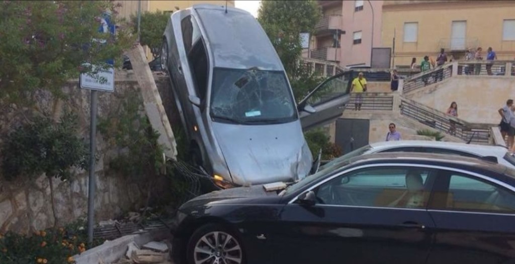 Drammatico incidente oggi a Valderice in provincia di Trapani. Come si vede nella foto pubblicata da Trapani Oggi, una Fiat Stilo condotta da una donna è piombata da via Regione su due auto parcheggiate.