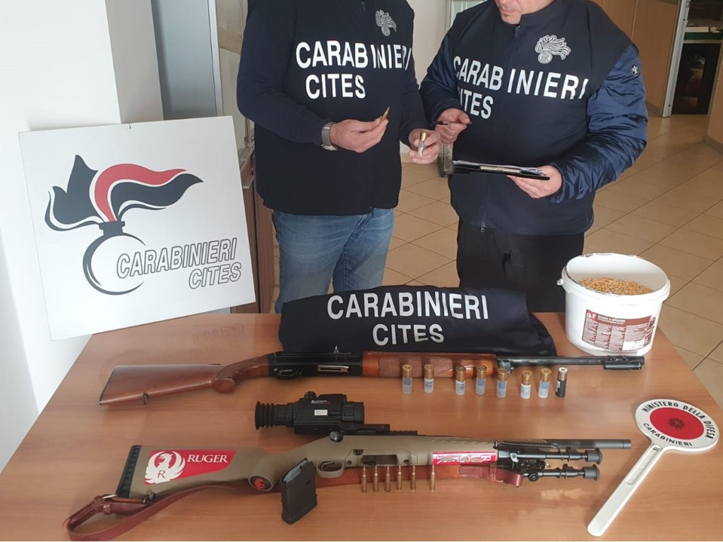 Nel terreno sono state trovate alcune buche piene di mais e alcune postazioni dove i bracconieri si sarebbero riparati in attesa dell’arrivo degli animali. Ai due uomini sono state sequestrate le armi, le munizioni e i mezzi di caccia.