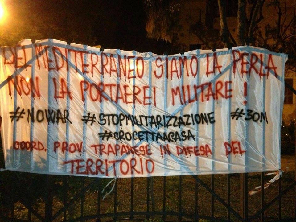 Stamani Marsala si è svegliata con striscioni in centro storico e nell’area periferica limitrofa all’aereoporto di Birgi riportanti la frase “Del Mediterraneo siamo la perla e non la portaerei militare #crocettaacasa #nowar #stopmilitarizzazione” .