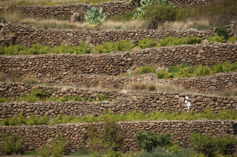 Chilometri di pietre accatastate ospitano viti ad alberello, olivi potati per crescere a poche decine di centimetri da terra, capperi e agrumi, in un contesto dal grande valore estetico.