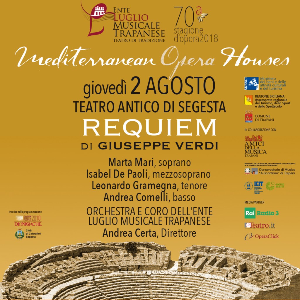 Appuntamento il 2 agosto, alle ore 19.30, al Teatro Antico di Segesta, con l’esecuzione della Messa da Requiem di Giuseppe Verdi per Alessandro Manzoni. Opera straordinaria, insieme intima e sontuosa, nota al pubblico per la sua imponenza, nell’esecuzione a Segesta si gioverà di un’importante messinscena.