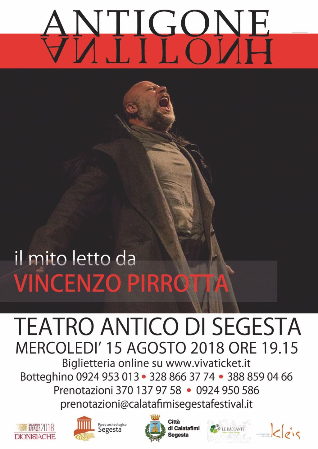 Domani alle 19.15, un reading su Antigone con Vincenzo Pirrotta, al Teatro Antico di Segesta. Prosegue con successo il Calatafimi Segesta Festival – Dionisiache 2018, la manifestazione organizzata dal Comune di Calatafimi Segesta, con la collaborazione del Parco Archeologico di Segesta e la direzione artistica di Nicasio Anzelmo. La lettura, che vedrà il coinvolgimento del pubblico, è una produzione dell’Associazione Culturale Kleis. Pirrotta sarà accompagnato dal chitarrista Charlie Di Vita.