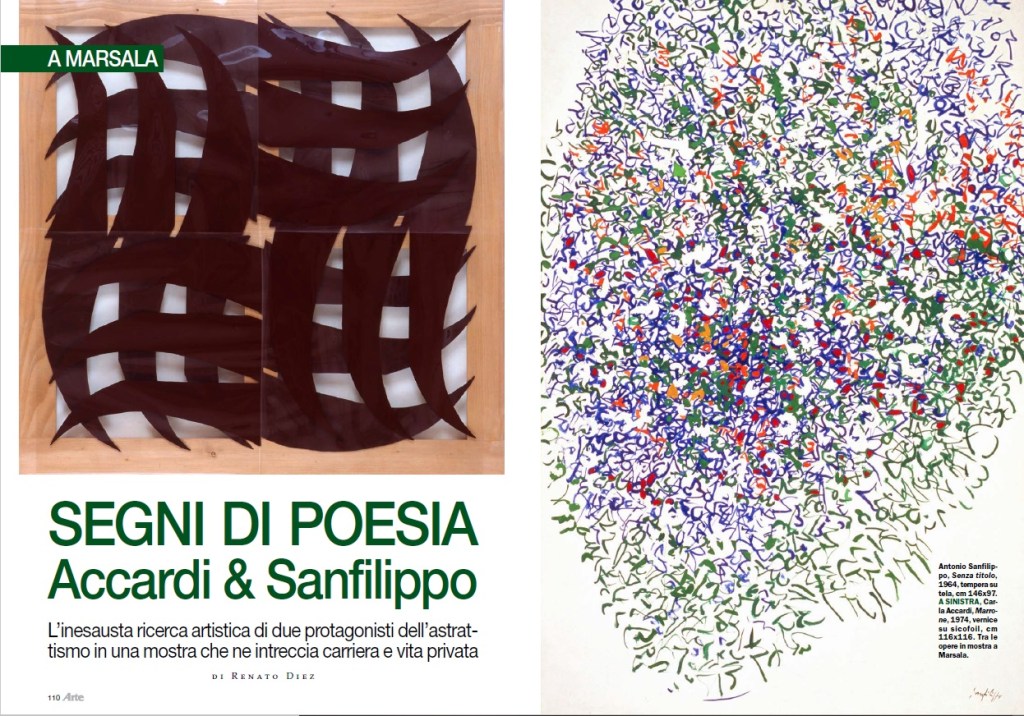 La mostra su Accardi e Sanfilippo, alla quale il mensile ARTE (Cairo Editore) ha dedicato nel mese di settembre un ampio servizio di sei pagine, è un viaggio intorno a quarant’anni di segni, colori, trasparenze, silenzi: dagli esordi degli anni Quaranta, con pennellate dense e pastose che si scompongono e perimetrano in tasselli di colore puro; fino alla polarizzazione positivo-negativo degli anni Cinquanta; quindi di nuovo il colore, con un segno rimpicciolito, ridotto a brevi tracciati organizzati in sequenze o riuniti dentro galassie simili ai balloon dei fumetti; infine la ricerca della trasparenza per l’una, il silenzio per l’altro.