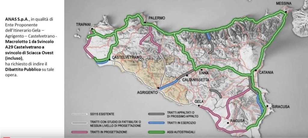 Al momento infatti, l’azienda ha proceduto a redarre il documento di fattibilità e il dossier di progetto da sottoporre alla cittadinanza attraverso, come sopra detto, la forma del dibattito pubblico prevista dalle norme nell’ambito del processo di informazione, partecipazione e confronto pubblico. Cittadinanza attiva che sarà chiamata a decidere sulle tre alternative disponibili. La prima prevede un nuovo tracciato rispetto all’esistente SS115, posto più a nord rispetto all’infrastruttura esistente. Un percorso da poco più di 25 chilometri, con 9 viadotti, di cui 3 da adeguare, 2 gallerie naturali e 4 artificiali. Sei gli svincoli previsti in questa alternativa. La seconda opzione invece ricalca l’attuale percorso della SS115, con l’aggiunta di una carreggiata rispetto a quella esistente. La terza opzione ricalca fondamentale la seconda, dalla quale si discosta solo in termini altimetrici. Nell’ambito del progetto, è comunque prevista la creazione di una carreggiata a due corsie da 3,75 metri ciascuna, con una bachina e uno spartitraffico da 3,5 metri. Una volta decisa la strada da intraprendere, si potrà procedere alla redazione del progetto plano-altimetrico, del progetto di mitigazione agro-ambientale e del quadro economico dell’intervento.