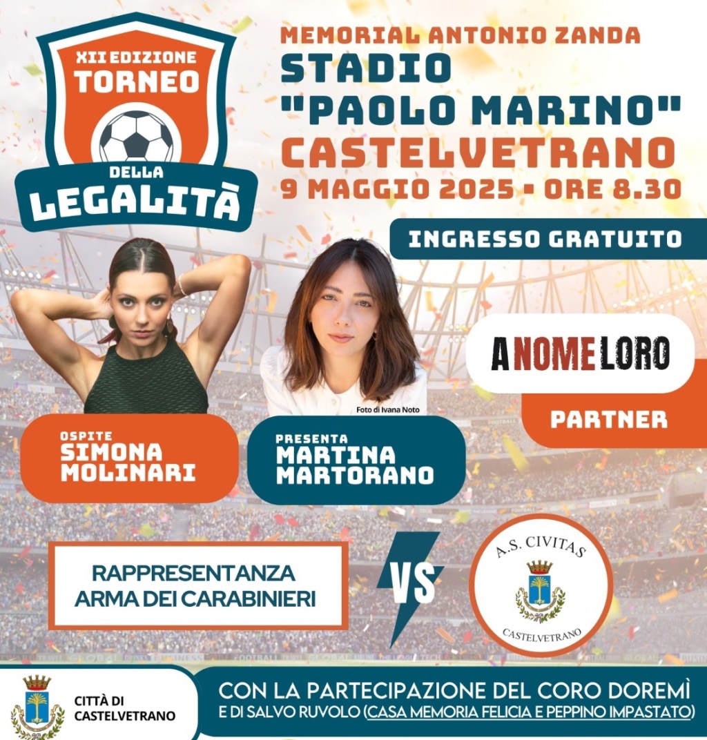 Il prossimo 9 maggio si svolgerà il torneo della legalità a Castelvetrano organizzato dall’associazione A.S. Civitas. Quest’anno è la dodicesima edizione che si è arricchita della collaborazione dell’Associazione “A Nome Loro” che organizza lo spettacolo musicale che si svolgerà al parco archeologico di Selinunte il 13 settembre.